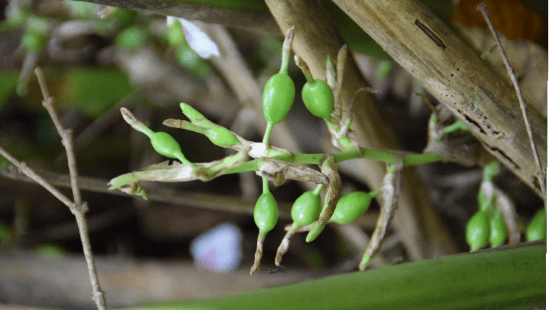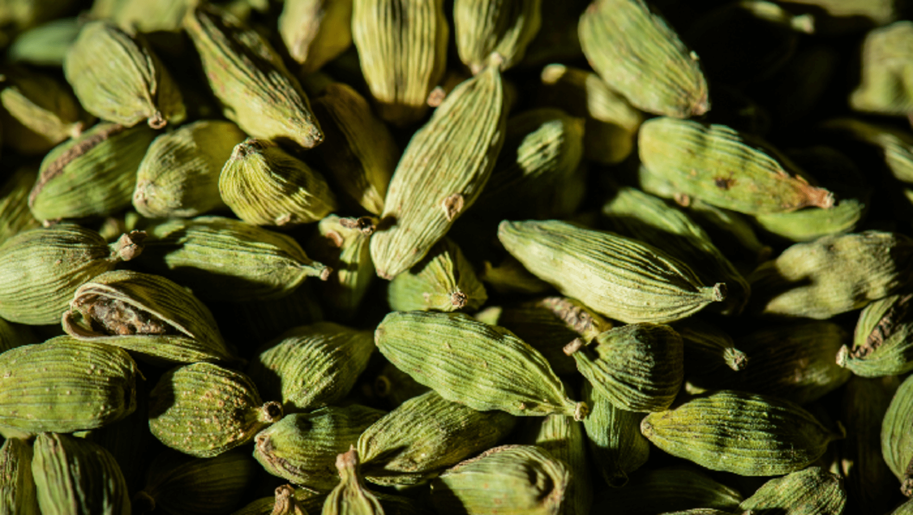 Cardamom pods are pale green and contain small, highly fragrant black or brown seeds. The plant’s flowers are pink and white and the pods mature on a climbing vine.
