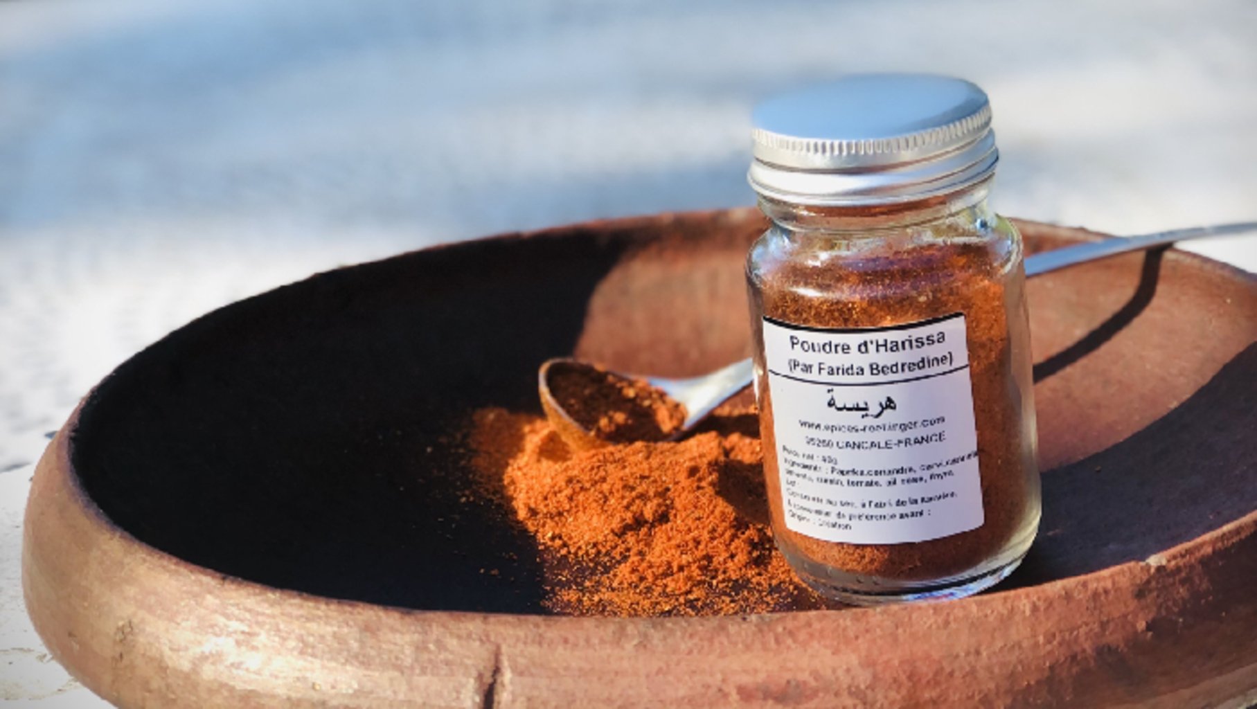 My goal was to create a harissa powder that matched the flavors and sensations evoked by Farida Bedredine.Farida is a journalist, media personality (TV-Radio) and chef who is passionate about cooking. She has written several cookbooks, including her most recent, 'I Love Food' (Editions First, 2018). Farida is interested in all types of cuisine from around the world. For her, 'Cooking is culture you experience through taste.' She told me that working on this harissa represented a return to the foods of her childhood and an hommage to the Kabyle culture of Northern Algeria.