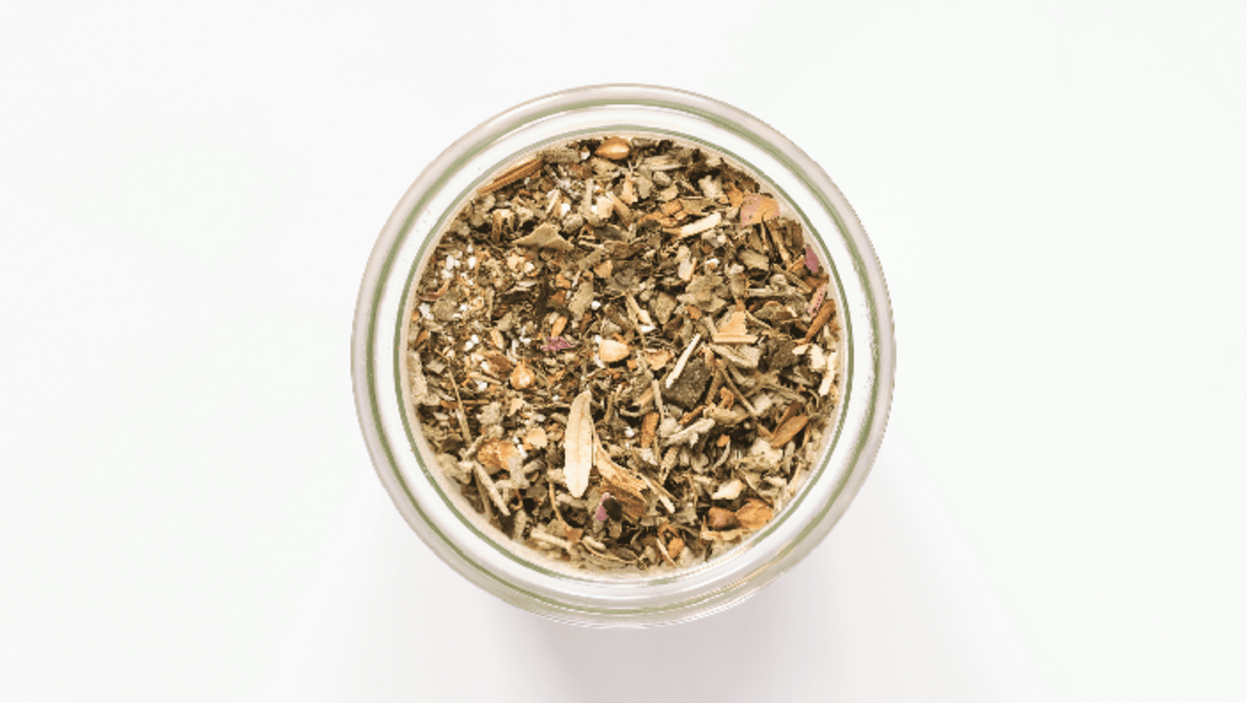 Ingredients: Tulsi (holy basil), California poppy, lemon balm, buckwheat, seaweed, rose petals, spices.