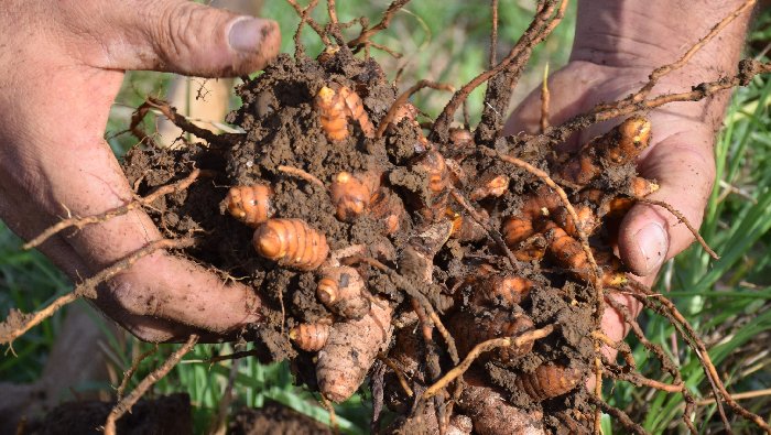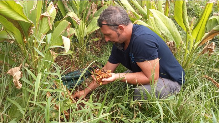 Didier grows his turmeric roots on a hectare (2 ½ acres) of land in the plains region of Guadeloupe. He uses sustainable agro-ecology cultivation practices and allows other crops such as ginger, fruit trees, and vanilla vines to thrive alongside his turmeric. All weeding is carried out by hand. The turmeric variety Didier grows was first discovered in small vegetable gardens in Guadeloupe. The rhizome harvest takes place from March to May. Once the roots have been sorted and calibrated, Didier dries them himself before grinding them to a powder on the farm.