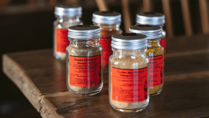 La Poudre Gallo - genièvre, bois d´Indes, girofle, zeste d´orange, laurier – parfume volailles et viandes blanches. La Poudre défendue - anis vert, gingembre, cannelle – réveille les salades de fruits et les cocktails, la Poudre Grande Caravane - cardamome, fenugrec, cannelle, niora, et sésame – donne sa chaleur aux légumes et à l’agneau. La Poudre Serinissima - girofle, gingembre, maniguette, safran – amuse la ratatouille et les tomates. La Poudre des Alizés - gingembre, sichuan, piment, moutarde - met un grand coup de vent dans la vinaigrette et la Poudre Retour des Indes - curcuma, coriandre, badiane, macis, sichuan, cumin – magnifie poissons et crustacés…