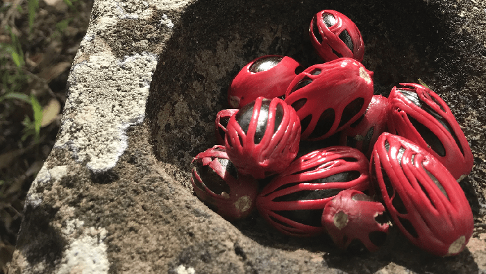 La noix de muscade, protégée par une coque brune et brillante, est séchée pendant 2 mois à l’ombre des entrepôts. La coque est brisée pour obtenir à l’intérieur la noix de muscade de couleur brun clair.